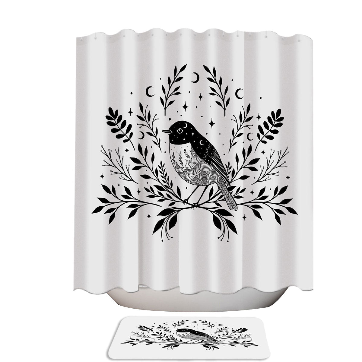 Black and White Bird with Leaves and Moon Shower Curtains