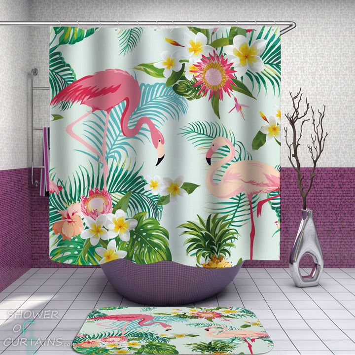 Shower Curtains with Flamingos and Fresh Tropical Flowers