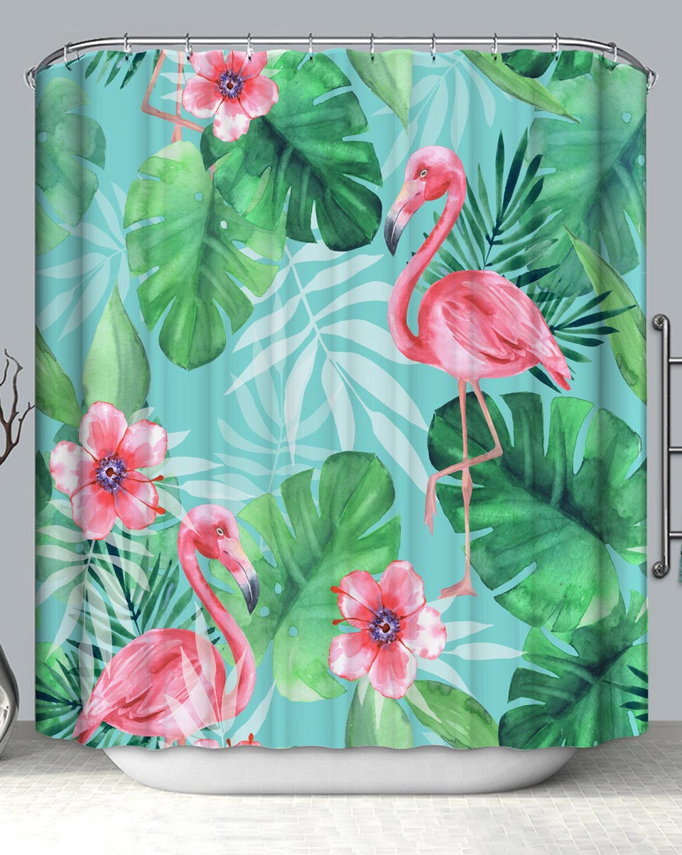 Flamingo Shower Curtain Design with Flamingos Hibiscus Flowers and Tropical Leaves