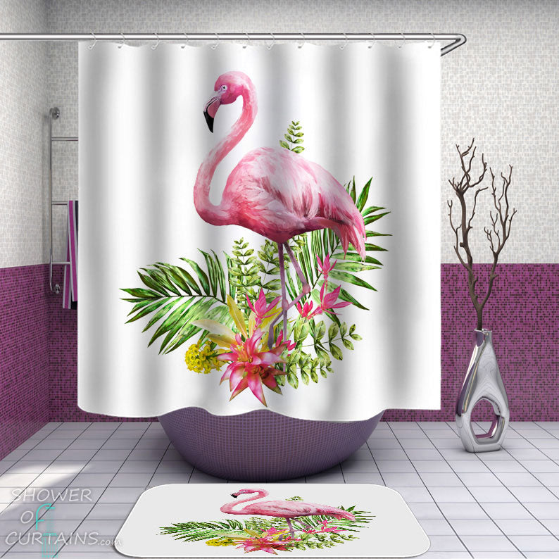 Shower Curtains with Pink Flamingo and Tropical Flowers