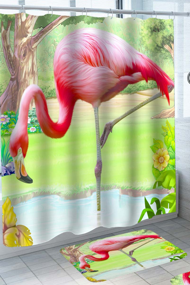 Tropical Shower Curtains Lake and Bright Pink Flamingo
