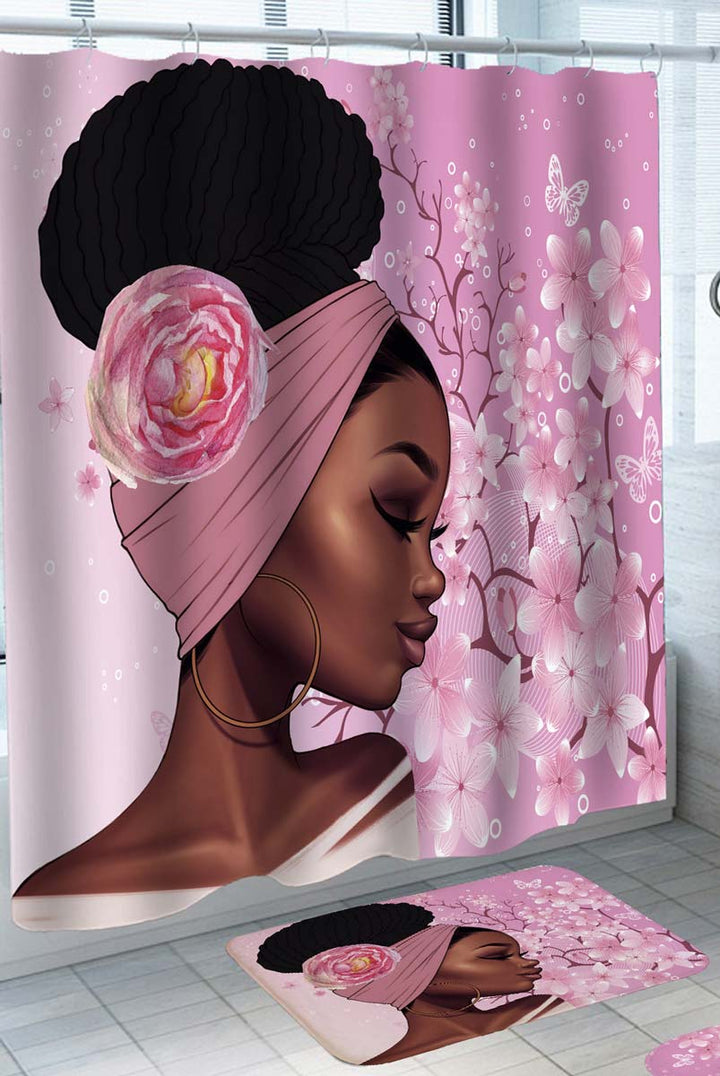 Beautiful Black Girl Shower Curtains with Pink Flowers
