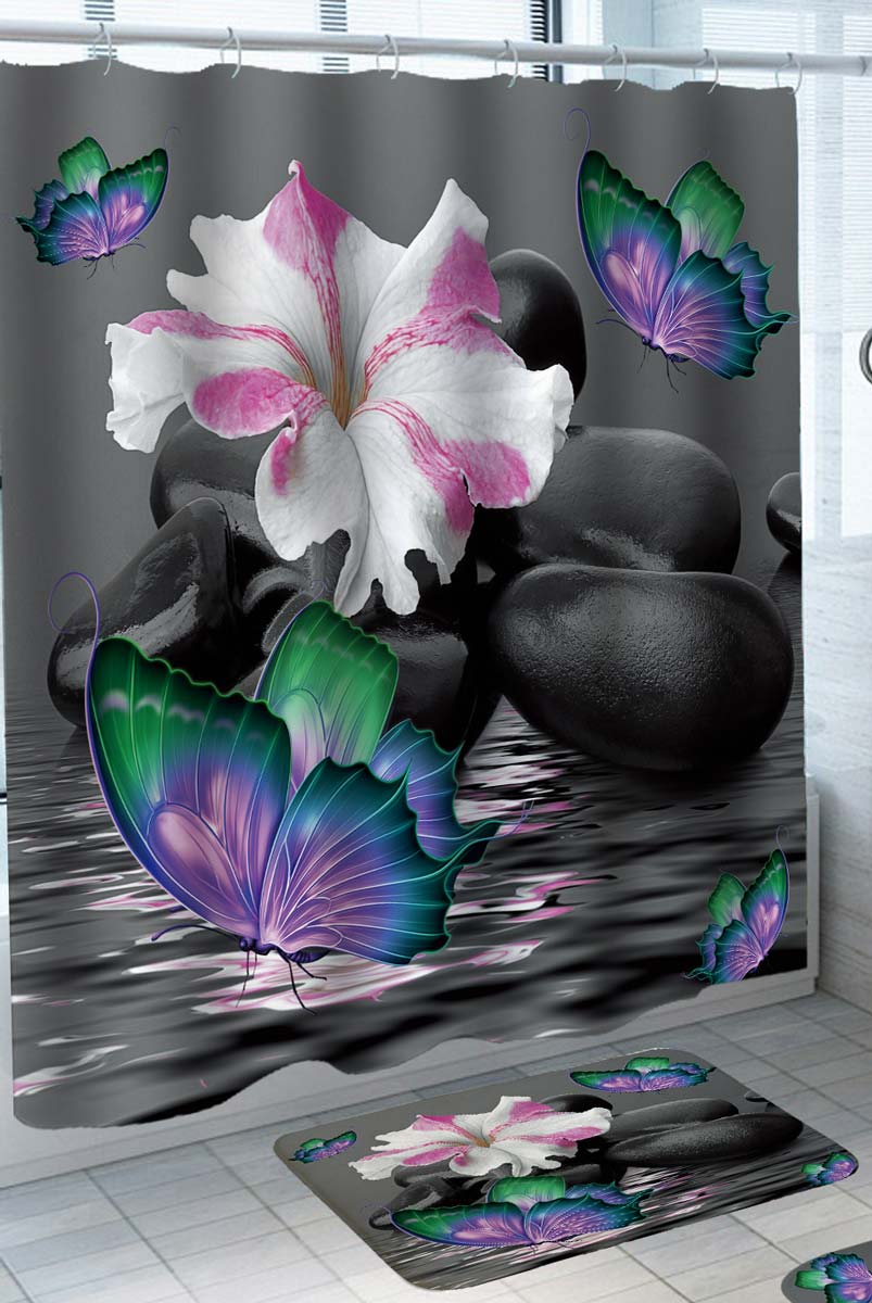 Spa Shower Curtains Hibiscus Flower Butterflies Pebbles