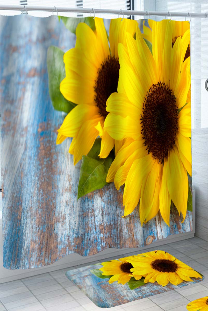 Shower Curtains with Sunflowers on Worn Out Blue Deck
