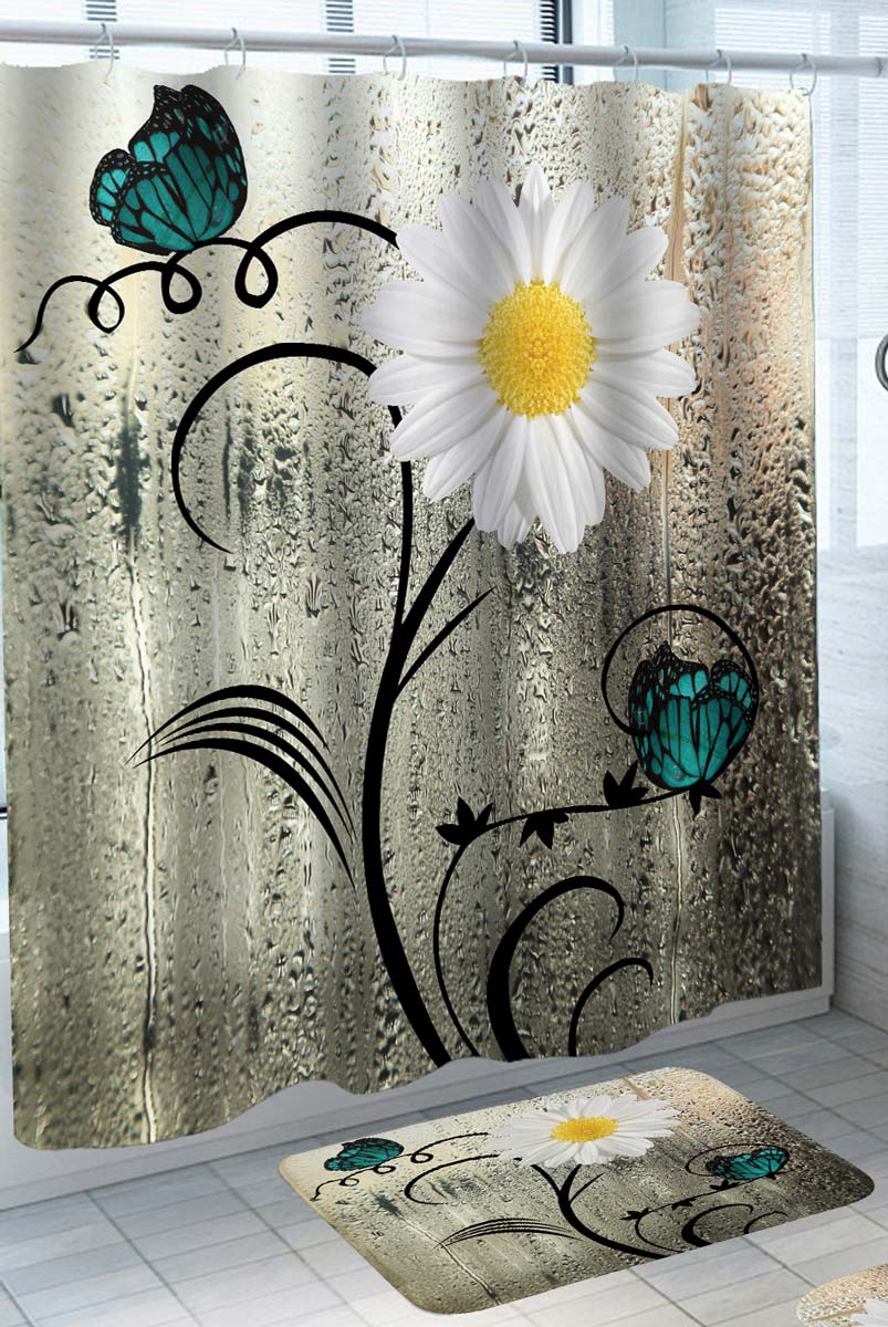 White Flower and Butterflies over Rainy Glass Shower Curtain